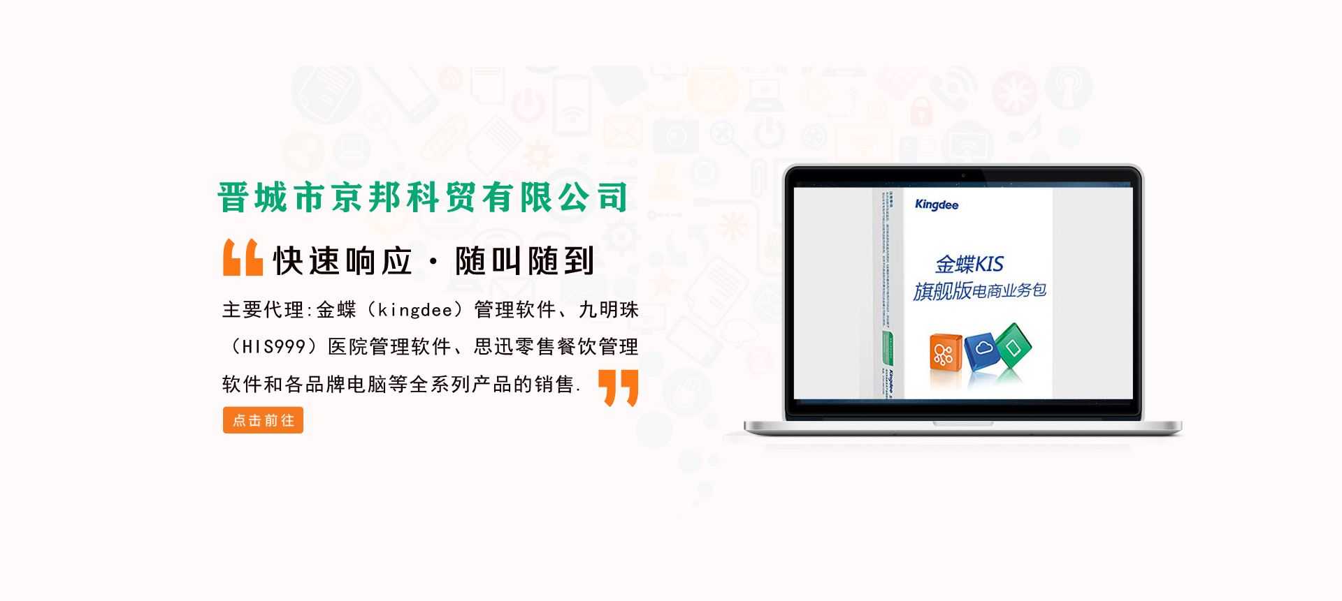 晉城市京邦科貿(mào)有限公司成立于2006年,是經(jīng)晉城市工商行政管理局登記注冊(cè),主要從事軟件銷(xiāo)售、電腦銷(xiāo)售和企業(yè)管理咨詢(xún)等相關(guān)業(yè)務(wù),是金蝶軟件(中國(guó))有限公司、深圳九明珠信息科技有限公司、深圳萬(wàn)國(guó)思迅軟件有限公司在晉城地區(qū)高級(jí)代理商,主要代理金蝶(kingdee)管理軟件、九明珠(HIS999)醫(yī)院管理軟件、思迅零售餐飲管理軟件和各品牌電腦等全系列產(chǎn)品的銷(xiāo)售。